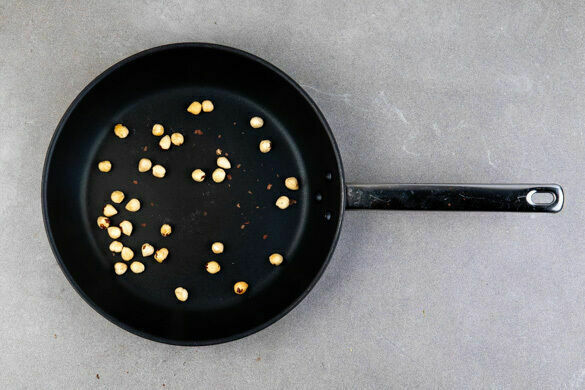 Die Haselnüsse in einer großen Pfanne ohne Zugabe von Fett bei mittlerer Hitze 1–2Min. goldbraun anrösten. Vorsicht, sie können schnell zu dunkel werden. Zum Abkühlen aus der Pfanne nehmen und beiseitestellen. Die Pfanne aufbewahren.