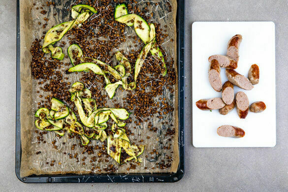 Den restlichen Käse unter die Zucchini und die Linsen mengen. Die Würste in dünne Scheiben schneiden und auf dem Zucchini-Linsen-Gemüse anrichten. Nach Belieben mit der Gremolata garnieren und servieren.