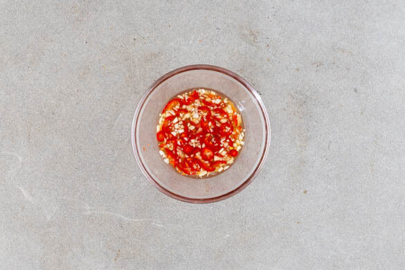Die Limette halbieren und auspressen. Den Knoblauch schälen und fein würfeln. Die Chilischote quer halbieren und eine Hälfte in dünne Ringe schneiden. Den Limettensaft mit der ½ der Fischsauce, dem Knoblauch, den Chiliringen, 1TL Zucker und 3EL Wasser gründlich verrühren. Mit ggf. mehr Fischsauce, Chilischote oder Zucker abschmecken.