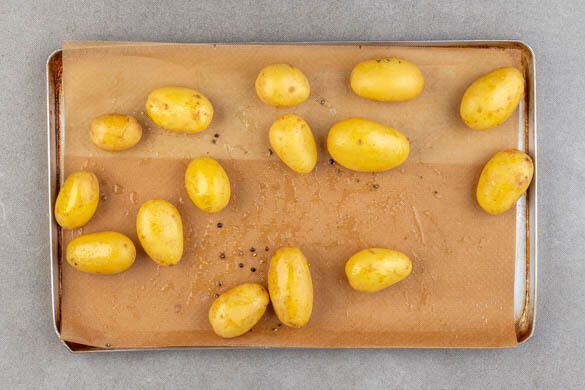 Den Grill vorheizen. Den Backofen auf 230°C (210°C Umluft) vorheizen. Größere Kartoffeln ggf. halbieren, dann die Kartoffeln in einer Auflaufform mit 1EL Olivenöl, 1 kräftigen Prise Salz und 1 Prise Pfeffer vermengen und in 20–25Min. im Ofen goldbraun rösten.