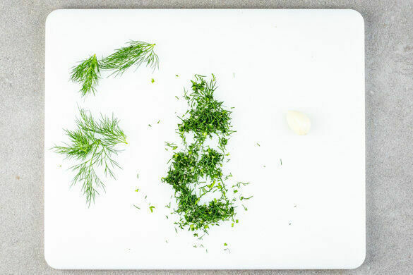 Den Knoblauch schälen, mit auf eines der Bleche geben und 7–10Min. mitrösten. Einige Dillspitzen abzupfen und für die Garnitur beiseitelegen. Den restlichen Dill sehr fein schneiden.
