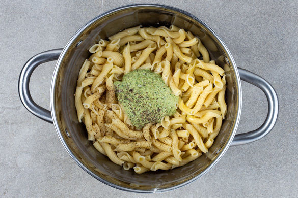 In einem großen Topf ausreichend gesalzenes Wasser für die Pasta zum Kochen bringen. Die Pasta in das kochende Wasser geben und in 6–8Min. bissfest kochen. 1 Tasse Pastawasser abschöpfen, dann die Pasta in ein Sieb abgießen und abtropfen lassen.