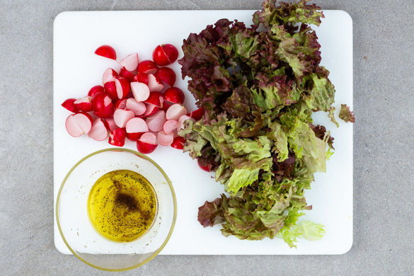 Die Radieschen vierteln. Den Salat vom Strunk befreien und in mundgerechte Stücke schneiden. Aus 2–3EL Olivenöl, 1–2EL Essig sowie Salz, Pfeffer und Zucker ein Dressing anrühren und mit dem Salat und den Radieschen vermengen.