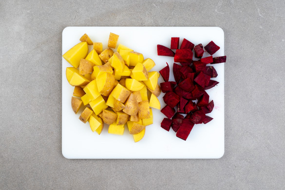 Den Backofen auf 240°C (220°C Umluft) vorheizen. Die Kartoffeln samt Schale in ca. 2cm große Würfel schneiden. Die Rote Bete schälen und in ca. 1,5cm große Würfel schneiden. Tipp: Da Rote Bete stark färbt, beim Verarbeiten am besten Küchenhandschuhe und Schürze tragen.