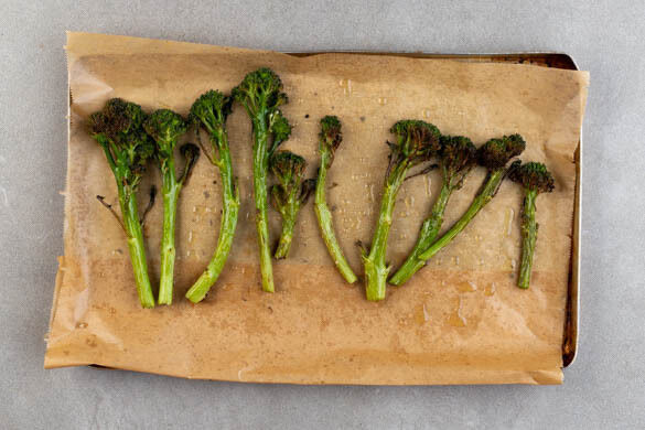 Die Brokkolini auf einem mit Backpapier ausgelegten Backblech mit 1EL Olivenöl und je 1 Prise Salz und Pfeffer vermengen. Im Ofen 10–12Min. rösten, bis die Brokkolini gar und appetitlich gebräunt sind.