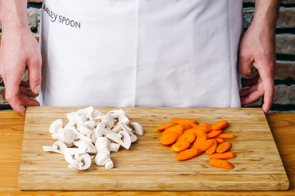 Die Pilze ggf. säubern und je nach Größe vierteln oder achteln. Die Karotte ggf. schälen und schräg in dünne Scheiben schneiden. In einem kleinen Topf 400ml leicht gesalzenes Wasser für den Reis zum Kochen bringen.