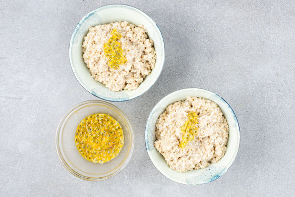 Die Passionsfrüchte halbieren und das Fruchtfleisch mit einem Löffel aus der Schale lösen. Den Porridge nach Geschmack mit dem Limettenabrieb verfeinern.