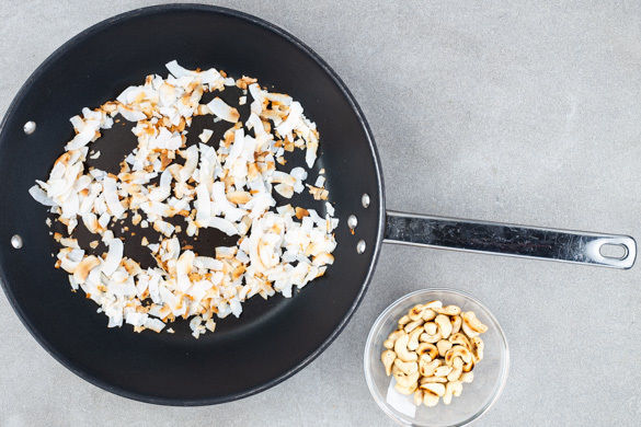 Die Cashews in einer kleinen Pfanne ohne Zugabe von Fett bei mittlerer Hitze ca. 2Min. goldbraun anrösten. Vorsicht, die Cashews können schnell verbrennen. Auf einem Teller beiseitestellen. Die Kokosflocken in derselben Pfanne ebenfalls goldbraun anrösten.
