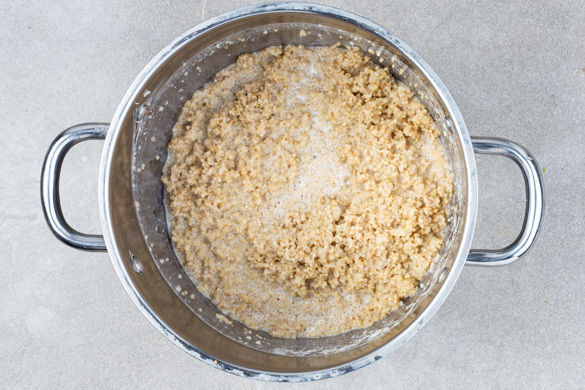 Die Quinoa, 1 Prise Salz und 3TL Zucker in die kochende Flüssigkeit geben und abgedeckt ca. 12Min. bei mittlerer Hitze kochen lassen. Dann weitere 5Min. ohne Deckel köcheln lassen, bis der Porridge schön cremig ist.
