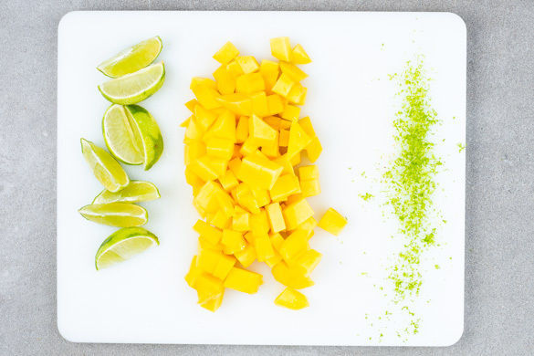 Die Mangos schälen, das Fruchtfleisch um den Stein herum abschneiden und in kleine Würfel schneiden. Die Limettenschale abreiben, dann die Limette in Spalten schneiden.