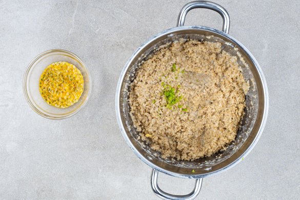 Die Passionsfrüchte halbieren und das Fruchtfleisch mit einem Löffel aus der Schale lösen. Den Porridge nach Geschmack mit dem Limettenabrieb verfeinern.