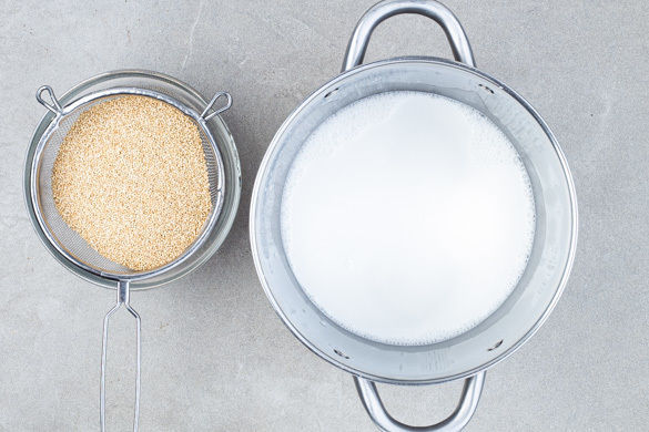 In einem mittelgroßen Topf die Kokosmilch mit 800ml Wasser zum Kochen bringen. Die Quinoa in einem feinmaschigen Sieb mit kaltem Wasser abspülen, bis das Wasser klar bleibt.
