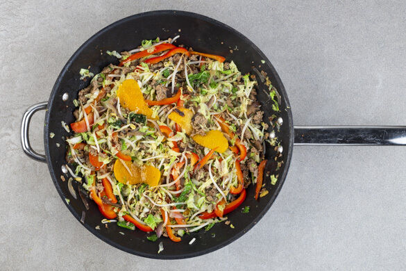 Den Gemüsemix und die Orangenschale zum Hackfleisch in die Pfanne geben und alles 4–5Min. anbraten, bis das Gemüse gar ist. Dabei nach Bedarf etwas Wasser hinzugeben.