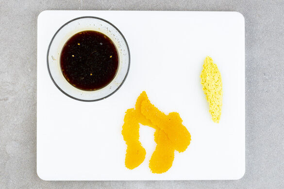 In einem kleinen Topf 300ml leicht gesalzenes Wasser zum Kochen bringen. Mit einem Sparschäler 4 breite Streifen Orangenschale abschälen, dann die Orange halbieren und auspressen. 3EL Orangensaft mit der Teriyakisauce, 2EL Essig, 50ml Wasser, 2TL Zucker und 1 Prise Salz gut verrühren, bis sich der Zucker aufgelöst hat.