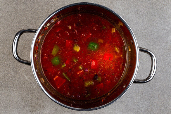 Die rote Paprika, die restliche grüne Paprika, die Zwiebeln und den Knoblauch in einem großen Topf mit 2EL Olivenöl und 1 kräftigen Prise Salz bei mittlerer Hitze 2–3Min. anbraten, dabei gelegentlich umrühren.
