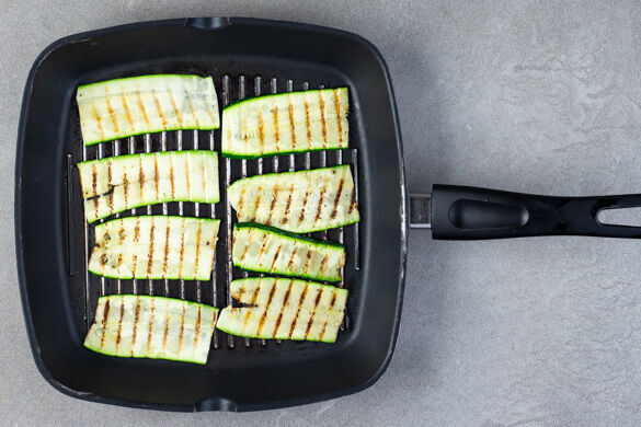 Eine Grillpfanne stark erhitzen. Sobald die Pfanne heiß ist, die Zucchinistreifen hineinlegen und auf jeder Seite 2–3Min. grillen, bis die Zucchini weich ist und sich Grillspuren abzeichnen. Die Zucchinistreifen aus der Pfanne nehmen und beiseitestellen. Tipp: Wer keine Grillpfanne hat, kann auch eine normale beschichtete Pfanne verwenden.