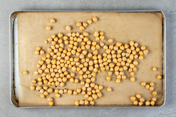 Den Backofen auf 220°C (200°C Umluft) vorheizen. Die Kichererbsen in einem Sieb kalt abspülen, abtropfen lassen und möglichst gut trocken tupfen. Dann mit 2EL Olivenöl sowie je 1 kräftigen Prise Salz und Pfeffer vermengen, auf zwei mit Backpapier ausgelegte Backbleche verteilen und in 12–15Min. im Ofen knusprig rösten. Zwischendurch die Position der Bleche tauschen.