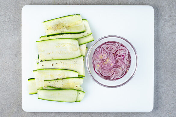 Die Zucchini quer halbieren, dann längs in dünne Streifen schneiden oder hobeln. Die Zucchinistreifen mit 1EL Olivenöl sowie je 1 kräftigen Prise Salz und Pfeffer vermengen. Die Zwiebel schälen, halbieren und in feine Streifen schneiden, dann in kaltem Wasser einweichen und beiseitestellen.