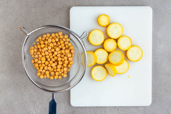 Den Backofen auf 220°C (200°C Umluft) vorheizen. Die Kichererbsen in einem Sieb mit kaltem Wasser abspülen und abtropfen lassen. Die Zucchini in 1–2cm dicke Scheiben schneiden.