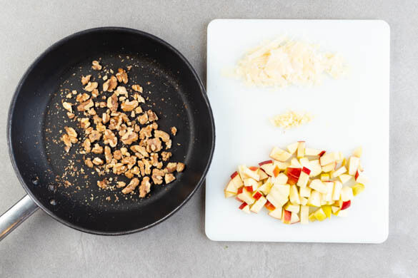 Die Walnüsse mit den Fingern in kleine Stücke brechen und in einer kleinen Pfanne ohne Zugabe von Fett bei mittlerer Hitze 1–2Min. anrösten. Vorsicht, sie können schnell zu dunkel werden. Den Apfel halbieren und in ca. 1cm große Würfel schneiden, dabei das Kerngehäuse entfernen. Den Knoblauch schälen und fein würfeln. Den Käse mit einem Sparschäler in feine Streifen hobeln.