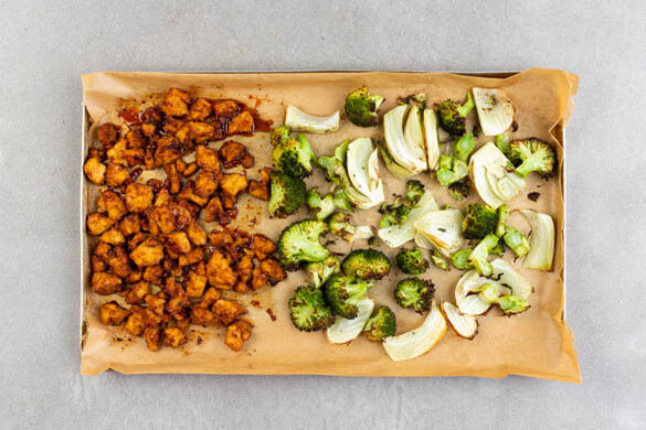 Den Backofen auf 240°C (220ºC Umluft) vorheizen. Den Brokkoli in mundgerechte Röschen zerkleinern und den Strunk in ca. 0,5cm dicke Scheiben schneiden. Die harten Stängel des Fenchels entfernen und ggf. vorhandenes Fenchelgrün für die Garnitur aufbewahren. Den Fenchel längs halbieren und eine Hälfte längs in ca. 2cm dicke Spalten schneiden.