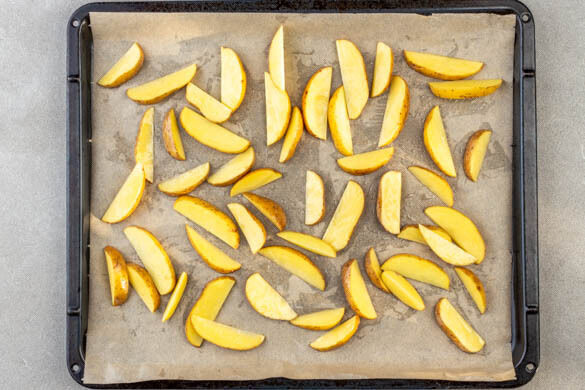 Den Ofen auf 240°C (220°C Umluft) vorheizen. Die Kartoffeln samt Schale in ca. 0,5cm dicke Spalten schneiden. Auf ein mit Backpapier ausgelegtes Backblech geben und mit 1EL Olivenöl und 1 kräftigen Prise Salz vermischen. Im Ofen 25–30Min. rösten, bis die Kartoffelspalten golden und knusprig sind.