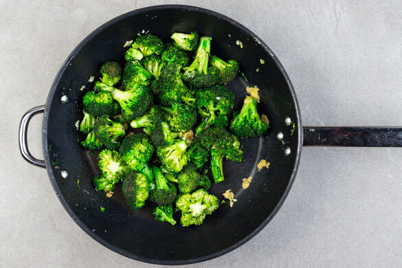 Den Brokkoli mit der Knoblauch-Ingwer-Paste in einer mittelgroßen Pfanne mit 1EL Pflanzenöl bei mittlerer bis starker Hitze unter häufigem Rühren ca. 2Min. anbraten. Mit der ½ der restlichen Sojasauce und 4EL Wasser ablöschen, mit je 1 Prise Salz und Pfeffer würzen und den Brokkoli bei mittlerer Hitze 5–6Min. garen. Bis zum Servieren abgedeckt warm halten.