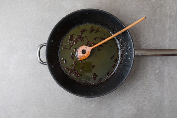 Die Zitrone halbieren und auspressen. 1–2EL Zitronensaft mit 2EL Olivenöl, 1EL Essig und 1TL Zucker verrühren. Das Dressing mit 2EL Wasser in die Pfanne geben und mit dem Bratensaft verrühren. Die Pfanne bei mittlerer Temperatur erhitzen und das Dressing um die Hälfte einkochen lassen.
