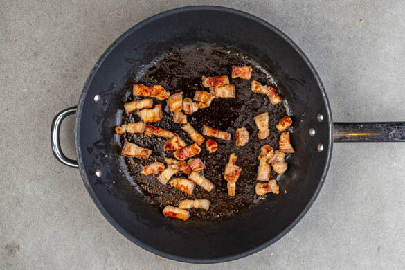 Den Schweinebauch in ca. 1cm breite Streifen schneiden und in eine große, kalte Pfanne geben. Mit je ½TL Salz und Pfeffer würzen und bei mittlerer Hitze erwärmen. Den Schweinebauch 5–7Min. braten, bis er knusprig und gar ist. Die Pfanne mithilfe eines Löffels leicht schräg stellen, das Fleisch in die obere Pfannenhälfte schieben und das Bratfett in der unteren Hälfte sammeln.