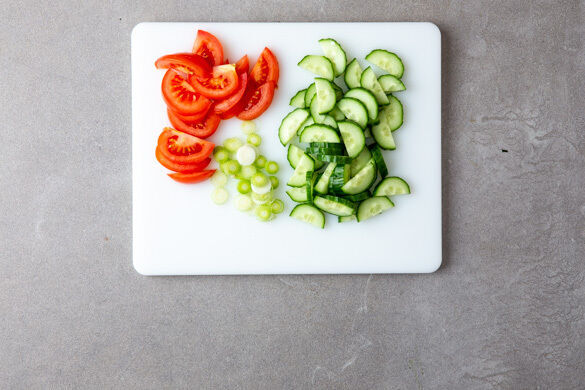 Die Tomaten in 1–2cm breite Spalten schneiden. Die Gurke längs halbieren und in dünne Scheiben schneiden. Die Lauchzwiebeln in feine Ringe schneiden.