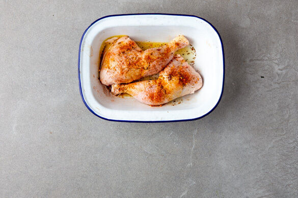 Den Backofen auf 240°C (220°C Umluft) vorheizen. Die Hähnchenschenkel trocken tupfen, dann mit der Gewürzmischung und 4EL Olivenöl einreiben.