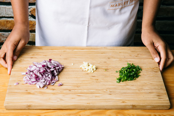 Die ½ der Zwiebeln, den Knoblauch und die ½ der Gewürzmischung in einem mittelgroßen Topf mit 1EL Olivenöl bei mittlerer Hitze 1–2Min. anbraten. 1½ Dosen Bohnen samt Flüssigkeit und die Korianderstängel zugeben und 12–15Min. einkochen. Mit Salz und ggf. mehr Gewürzmischung abschmecken und mit einem Kartoffelstampfer grob zerdrücken, sodass eine stückige Paste entsteht.