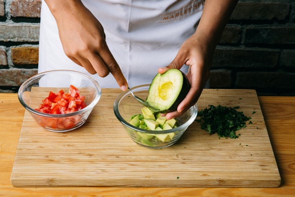 Die Korianderblätter fein schneiden. Die Tomaten in ca. 1cm große Würfel schneiden. Die Avocados halbieren und den Kern entfernen, dann das Avocadofruchtfleisch mit einem Messer kreuzweise in ca. 1cm große Würfel einschneiden und mit einem Löffel aus der Schale lösen.