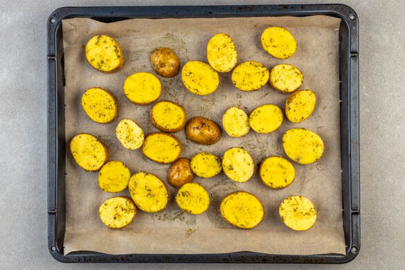 Den Backofen auf 240°C (220°C Umluft) vorheizen. Die Kartoffeln in ca. 2cm dicke, runde Scheiben schneiden, dann mit 2EL Olivenöl, der Knoblauch-Kräuter-Gewürzmischung, 1TL Salz und 1 Prise Pfeffer vermengen. Die Kartoffeln auf ein mit Backpapier ausgelegtes Backblech geben und ca. 20Min. im Ofen backen. Danach durchmischen und ca. 10Min. weiterbacken.