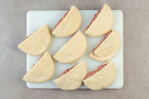 Die Pitabrote halbieren und jede Hälfte auf- aber nicht durchschneiden. Mit einem Esslöffel vorsichtig jede Pitahälfte gleichmäßig mit der Hackfleischmasse füllen, dabei das Hack sachte in die Pitataschen drücken. Langsam arbeiten, damit die Pitabrote nicht zerbrechen.