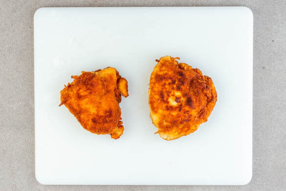 Eine große Pfanne ca. 0,5cm hoch mit Pflanzenöl befüllen und bei mittlerer Hitze erwärmen. Sobald das Öl heiß ist, die Schnitzel auf beiden Seiten in ca. 5Min. goldbraun und gar braten. Die Schnitzel aus der Pfanne nehmen und auf etwas Küchenkrepp abtropfen lassen. Von beiden Seiten mit je 1 Prise Salz und Pfeffer würzen und beiseitestellen.
