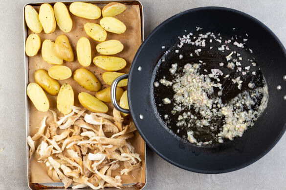 Die Kartoffeln aus dem Ofen nehmen und die Pilze auf der freien Seite des Backblechs mit 1TL Olivenöl und 1 Prise Salz vermengen. Die Kartoffeln und die Pilze weitere 7–10Min. backen, bis die Pilze appetitlich gebräunt sind. Die Schalotte und den Knoblauch schälen und fein würfeln, dann in der Pfanne mit 1EL Butter bei mittlerer Hitze ca. 3Min. glasig anbraten.