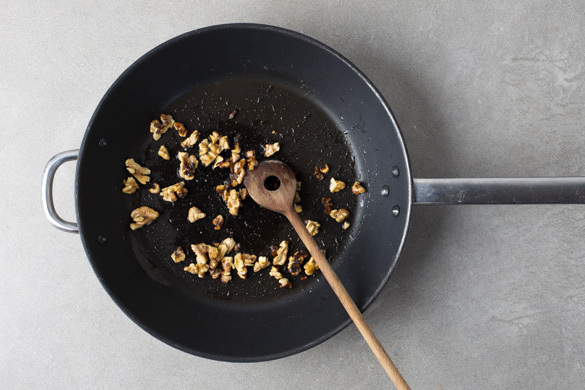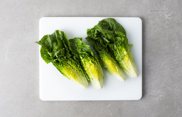 Den Romanasalat der Länge nach vierteln. Die Pfanne erneut erhitzen und den Salat bei mittlerer Hitze auf jeder Schnittseite in ca. 1Min. goldbraun anbraten, dann aus der Pfanne nehmen und beiseitestellen. Die Pfanne auf dem Herd lassen.