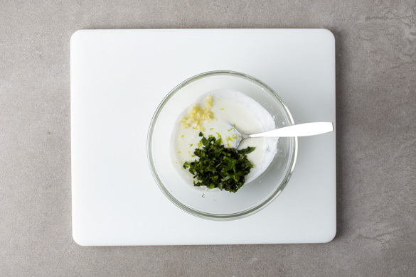 Die Minzeblätter abzupfen und ca. ⅓ der Minzeblätter für die Garnitur beiseitelegen, die restlichen Minzeblätter fein schneiden. Den Knoblauch schälen und fein würfeln. Den Joghurt mit der geschnittenen Minze, dem Knoblauch, dem restlichen Zitronensaft und 1 kräftigen Prise Salz gut verrühren und beiseitestellen.