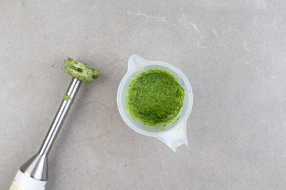 Inzwischen den Käse fein reiben. Das Basilikum samt Stängeln grob schneiden. Die Cashewkerne grob hacken. Das Basilikum, die Cashews und die ½ des Käses mit 4EL Olivenöl und 3–4EL Wasser in einem hohen Gefäß mit einem Stabmixer zu einem Pesto pürieren und mit Salz und Pfeffer abschmecken.