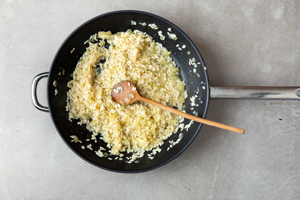 Die Zwiebeln in einer großen Pfanne mit 2EL Olivenöl bei mittlerer Hitze in 1–2Min. farblos anschwitzen. Dann den Reis dazugeben und 1–2Min. anrösten. Nach und nach mit der Brühe ablöschen und stetig rühren, damit der Reis nicht ansetzt. Diesen Vorgang 18–20Min. lang wiederholen, bis die Brühe aufgebraucht und der Reis bissfest ist.