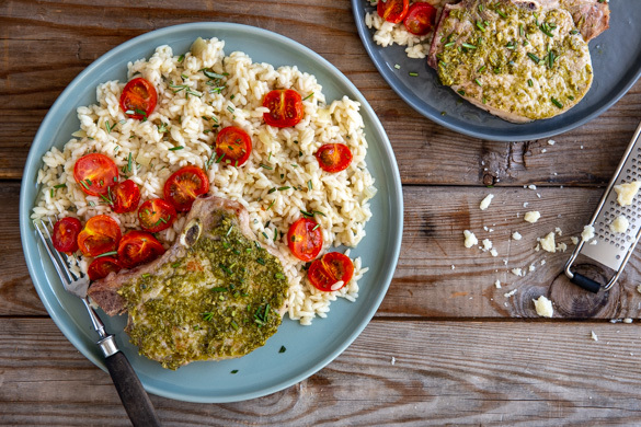 Mmh, das saftige Schweinekotelett wird heute mit einem schnell zubereiteten Pesto aus Basilikum, gerösteten Cashews und Käse garniert und mit einem wunderbar cremigen Risotto serviert, das mit aromatischen Rosmarin-Cherrytomaten auch einiges zu bieten hat. Große italienische Kochkunst und dabei gar nicht schwer umzusetzen. Ein Rezept, das du nicht zum letzten Mal wirst zubereitet haben.