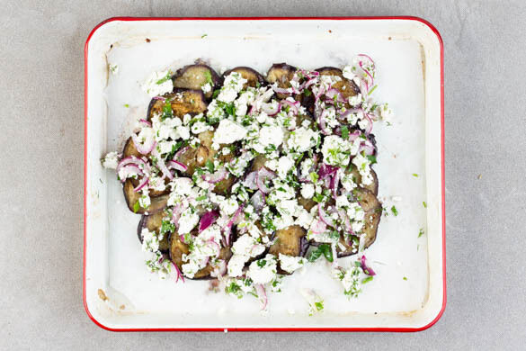 Die Zwiebeln in einer mittelgroßen Pfanne mit 1EL Olivenöl bei mittlerer bis starker Hitze 1–2Min. scharf anbraten. Den Knoblauch zugeben und ca. 1Min. mitbraten. Die Pfanne vom Herd nehmen und den Feta reinbröseln. Den Dill untermischen und nach Geschmack mit Salz und Pfeffer würzen. Die Auberginen mit der Fetamischung bedecken und 5Min. im Ofen überbacken.
