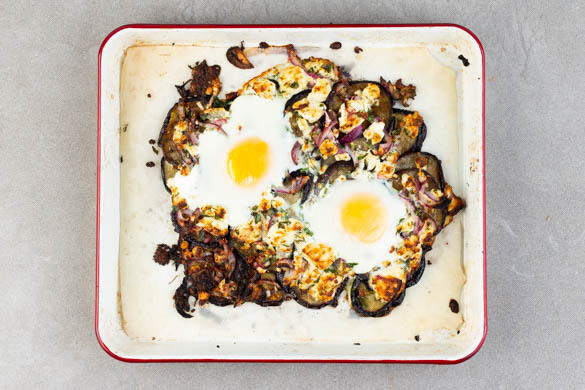 Die Eier einzeln aufschlagen und vorsichtig auf die Auberginen gleiten lassen. Noch ca. 6Min. im Ofen backen, bis die Eier gestockt sind.