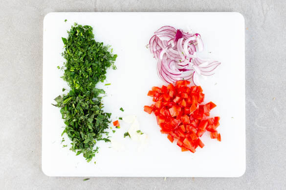 Die Petersilie samt Stängeln fein hacken. Die Minzeblätter abzupfen und fein schneiden. Den Dill samt Stängeln ebenfalls fein schneiden und getrennt aufbewahren. Die Zwiebel schälen, halbieren und in feine Streifen schneiden. Den Knoblauch schälen und in feine Scheibchen schneiden. Die Tomaten vierteln, entkernen und in kleine Würfel schneiden.