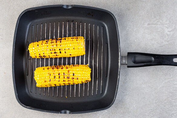 Eine Grillpfanne ohne Zugabe von Fett hoch erhitzen. Die Maiskolben in die heiße Pfanne legen, mit je 1 Prise Salz und Pfeffer würzen und ca. 5Min. grillen, bis der Mais stellenweise gebräunt ist, dabei gelegentlich wenden. Den Mais aus der Pfanne nehmen, auf einem Teller etwas abkühlen lassen, dann mit einem scharfen Messer vom Kolben schneiden. Die Pfanne aufbewahren.