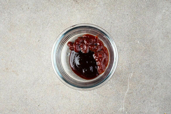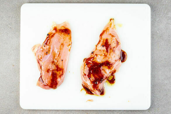 Das Fleisch trocken tupfen und jeweils horizontal halbieren. 2EL Olivenöl, 2EL hellen Essig, die ½ der BBQ-Sauce sowie je 1 Prise Salz und Pfeffer zu einer Würzsauce vermengen und das Fleisch damit einreiben.