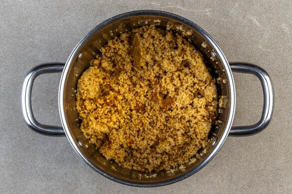 Währenddessen in einem kleinen Topf 300ml leicht gesalzenes Wasser zum Kochen bringen. Den Topf vom Herd nehmen, den Couscous und die Gewürzmischung in das kochende Wasser rühren und abgedeckt 6–8Min. quellen lassen. Den Couscous mit einer Gabel auflockern.