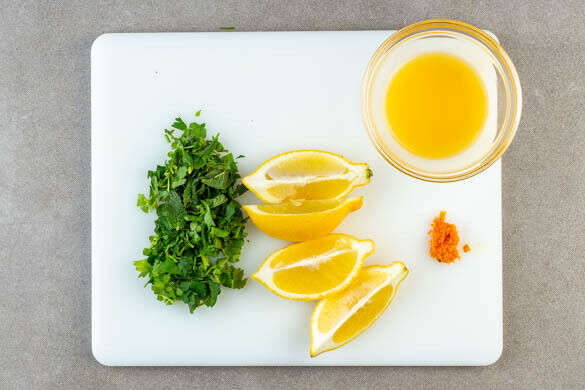 Die Minzeblätter von den Stängeln zupfen und mit der Petersilie grob schneiden. Die Orangenschale fein abreiben, dann die Orange halbieren und auspressen. Die Zitrone in Spalten schneiden.