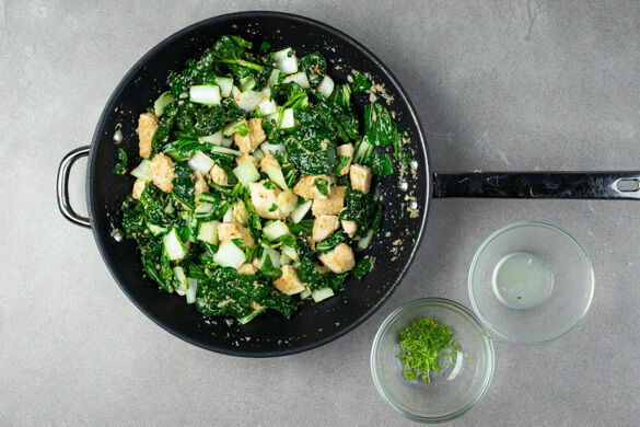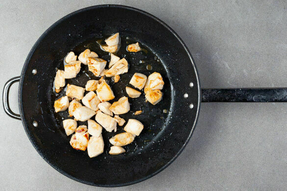 Das Fleisch in der Pfanne mit 2EL Pflanzenöl bei starker Hitze unter gelegentlichem Rühren 2–3Min. braten, bis es fast gar ist. Mit ½TL Salz würzen.
